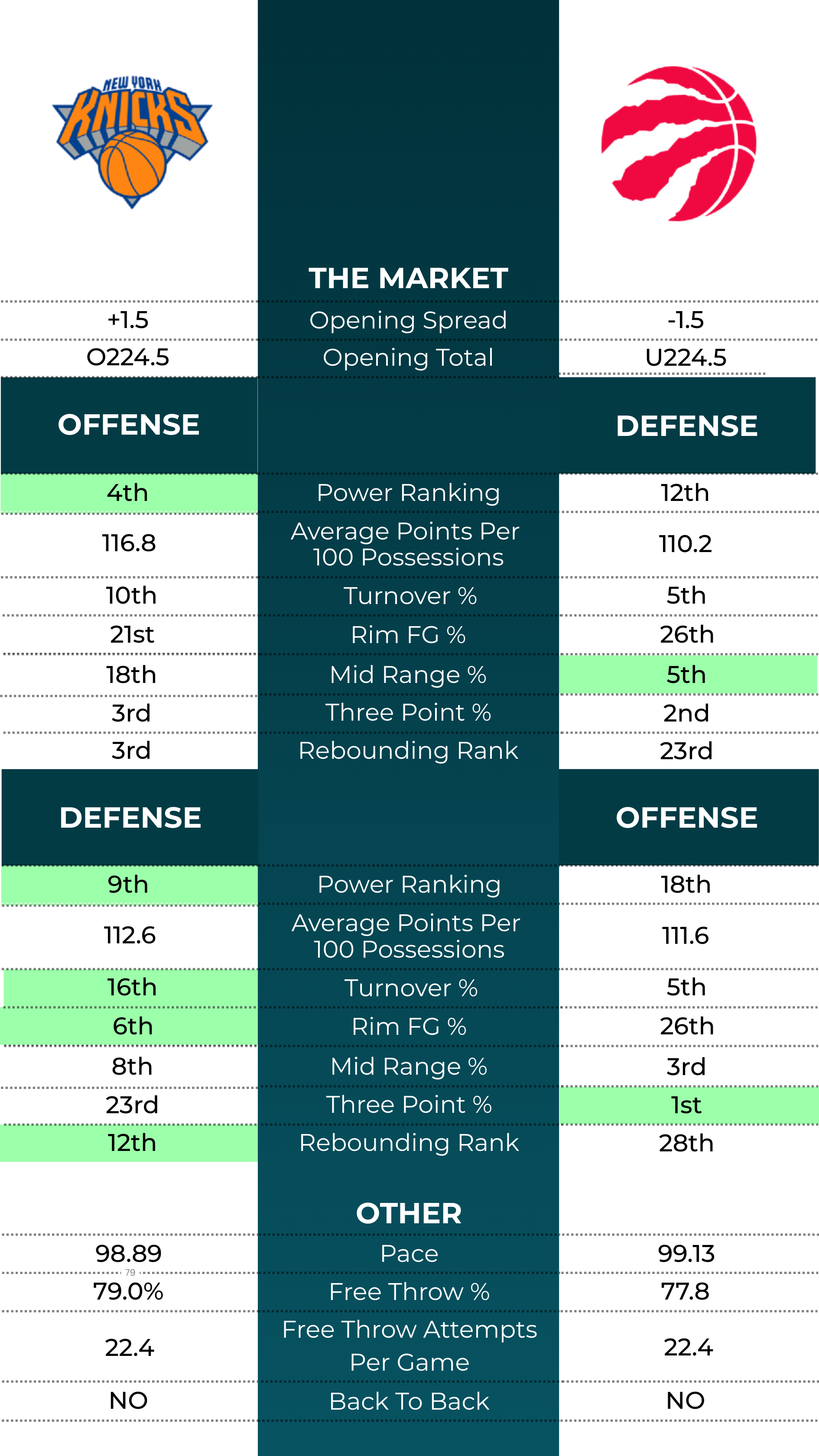 This is a tough scheduling spot for the Knicks, who are in the backend of a back-to-back with travel. The Knicks have not performed well in B2B spots this season (2-4 against the spread), and they have also struggled as road underdogs (1-4 against the spread). The Raptors have had the last two days off and should have the much fresher legs in this matchup. Toronto is playing very good basketball right now, riding a four-game win streak, with the most recent win coming on the road against the Thunder as a double-digit underdog. The bulk of the Knicks shot distribution comes from the three-point line, and Toronto ranks 2nd in the NBA in three-point defense. This is also a double-revenge spot for the Raptors, who lost both previous matchups against the Knicks this season. Our wager is a half-unit on the Raptors to capitalize on a favorable scheduling spot and extend their win streak.
