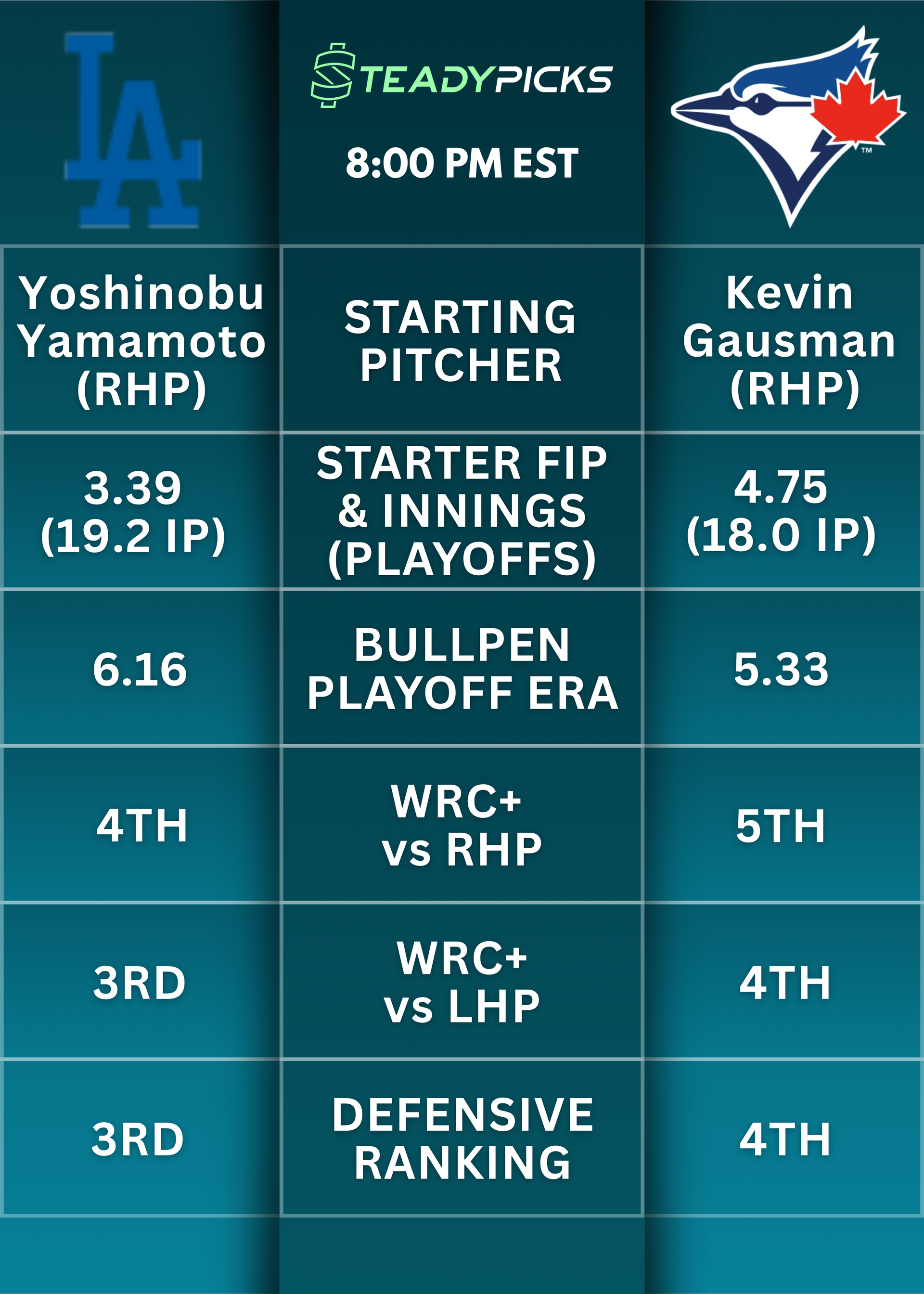 The Blue Jays lead the World Series 1-0 after a big offensive performance in Game 1. Both of these teams have top 5 ranked offenses and each also ranks inside the top 5 in DRS (Defensive Runs Saved). With neither team holding a notable edge in either of those categories, the pitching matchups become crucial. Dodgers starter Yoshinobu Yamamoto holds better metrics both in the regular season and in the postseason than Toronto starter Kevin Gausman. Yamamoto looked very sharp in his last outing, throwing a complete game against the Brewers, which eliminated the usage of the Dodgers' vulnerable bullpen. Blue Jays starter Kevin Gausman hasn’t looked as sharp with 6 walks in his last two appearances (6.2 innings). Neither bullpen has been reliable, making the later innings of the game a bit of a wild card. This was on full display last night in Game 1 with 11 runs scored after the 5th inning. The Dodgers have a fresh Roki Sasaki behind Yamamoto tonight, while the Blue Jays top relievers will all be available as well. At (-135) odds, we are going to lean on the Yamamoto/Sasaki combo to help the Dodgers pull out a win to even the series. Our wager is a half unit on the Dodgers moneyline.
