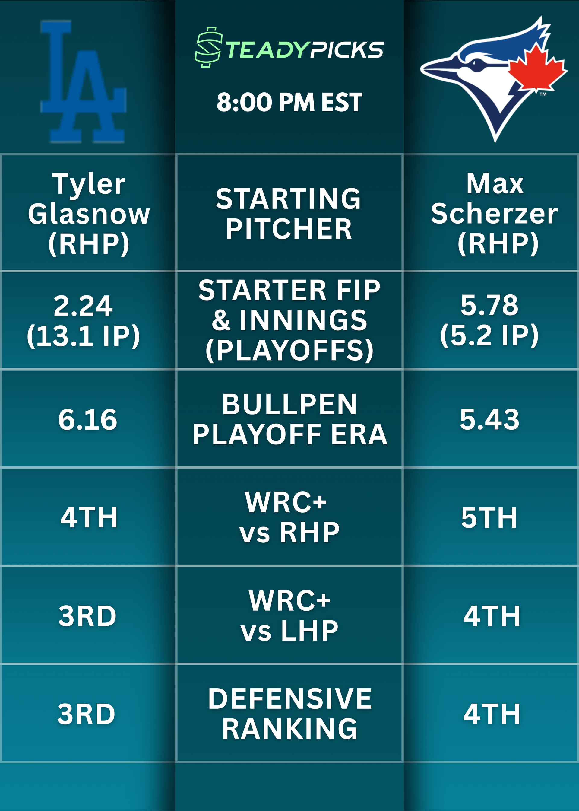The World Series is tied at 1-1 heading into tonight's Game 3. The series will move from Toronto to Los Angeles. Our MLB betting charts indicate that neither of these teams has a notable offensive or defensive advantage. Both teams' bullpens have struggled in the postseason, although the Dodgers' starters have done a great job pitching deep into games and minimizing their vulnerable bullpen. Our handicap in this series very much relies on the starting pitchers, given how close the teams rank to one another elsewhere. We see a notable edge for the Dodgers among the starters in Game 3. Tyler Glasnow holds a 2.24 FIP in 13.1 innings this postseason and had strong metrics in the regular season as well. Blue Jays starter Max Scherzer is a 41-year-old future first-ballot Hall Of Famer who pitched relatively well in his only start this postseason. Scherzer still holds a FIP in the 5s this postseason despite the decent start, and he was in extremely poor form prior to the postseason. While it’s certainly possible Scherzer could pitch well again, the metrics suggest he’s a liability out there, especially against an elite offense such as the Dodgers. Our wager is on the Dodgers to win tonight behind their starting pitching advantage.