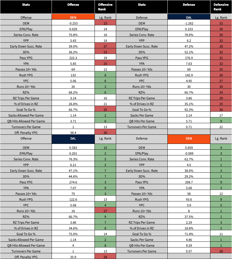 The Dallas Cowboys offense looks to be one of the more dangerous units in the NFL. They hold top 10 rankings in most key offensive metrics, although Dallas has been one of the most penalized offenses in the league. While we love the Cowboys offense’s ability to score points, their defense ranks toward the bottom of the NFL in most key metrics. Denver’s passing attack hasn’t hit its stride yet, but the Broncos rushing metrics are very good. This is a highly favorable matchup at home for the Broncos offense. The bigger key for us in this matchup is the Broncos defense, which is a top 5 unit with little to no weaknesses. We encourage a quick glance at our NFL betting charts for a visual representation of how good this Broncos defense is on paper. Denver has one of the best cornerbacks in the NFL (Patrick Surtain), which should help minimize the damage from either Lamb or Pickens. We will lay the -3 points with the Broncos.